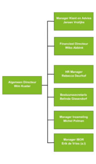 In deze afbeelding staat de organogram van het bestuur. Algemeen Directeur is Wim Kuster. Manager Inzameling is Michel Polman. Manager IBOR is Erik de Vries. Bestuurlijkssecretaris is Belinda Giesendorf. HR manager is Rebecca Deurhof. Financiën directeur is Wibo Abbink. Manager Klant en Advies is Jeroen Vrolijks.